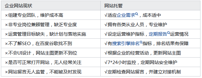 网站的运营维护涉及到很多专业岗位的专业知识,网站托管不但可以解决企业在网站建设后缺乏专业人员运营维护的问题,让专业的人做专业的事情;还可以通过网站托管,定期更新文章与产品服务的内容,让网站展示的内容跟上企业的发展步伐;而且网站托管后企业无需自己建立专业运营维护团队,在降低了企业经营成本的同时,因专业第三方托管团队的加入,从而提升网站的搜索排名为企业带来品牌效益。